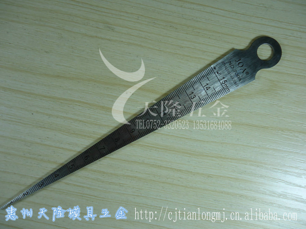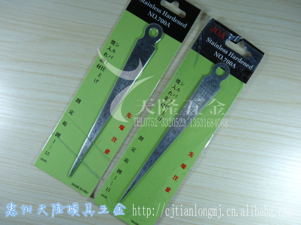 孔尺(孔径规)(间隙尺、喉部塞尺、喷嘴塞尺)特点及使用方法:孔尺适用于现场测量深度间隙、孔径、内径。用途广泛,结构简单合理、测量方便、快捷。省时、省力,提高工作效率。测量时将尺置于被测间隙或孔径内即可得出测量结果。
